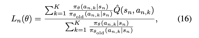 在大规模或连续动作空间 中,我们可以借助重要性采样 来构造代理目标函数的估计量。假设我们在状态下采样了 K 个动作