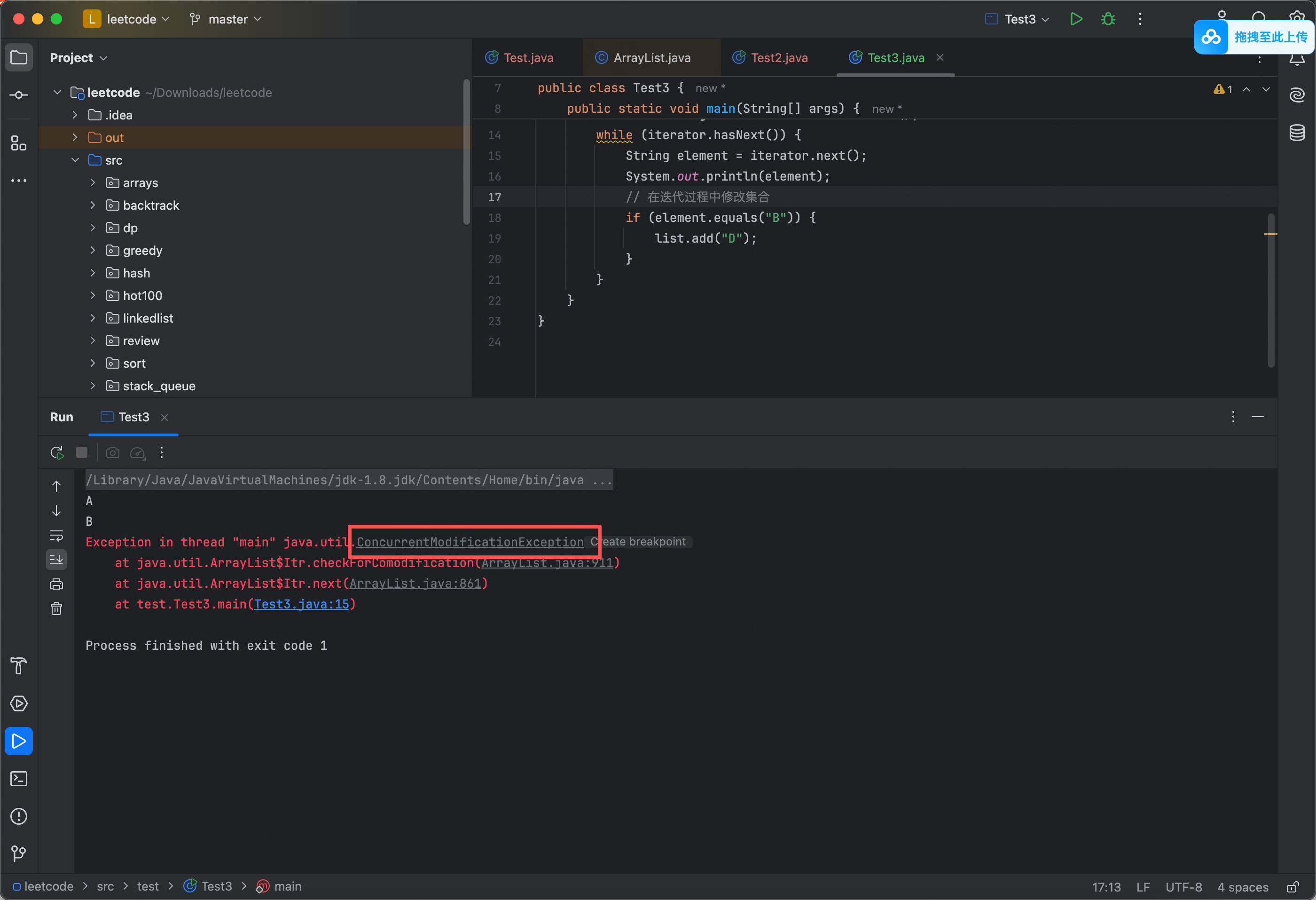 例如下列代码,在迭代过程中进行add操作,改变了modCount的值,也会抛出异常