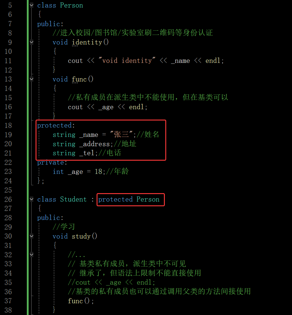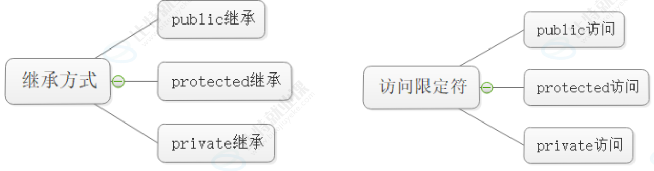 基类private成员在派生类中是不能被访问,如果基类成员不想在类外直接被访问,但需要在派生类中能访问,就定义为protected。可以看出保护成员限定符是因继承才出现的