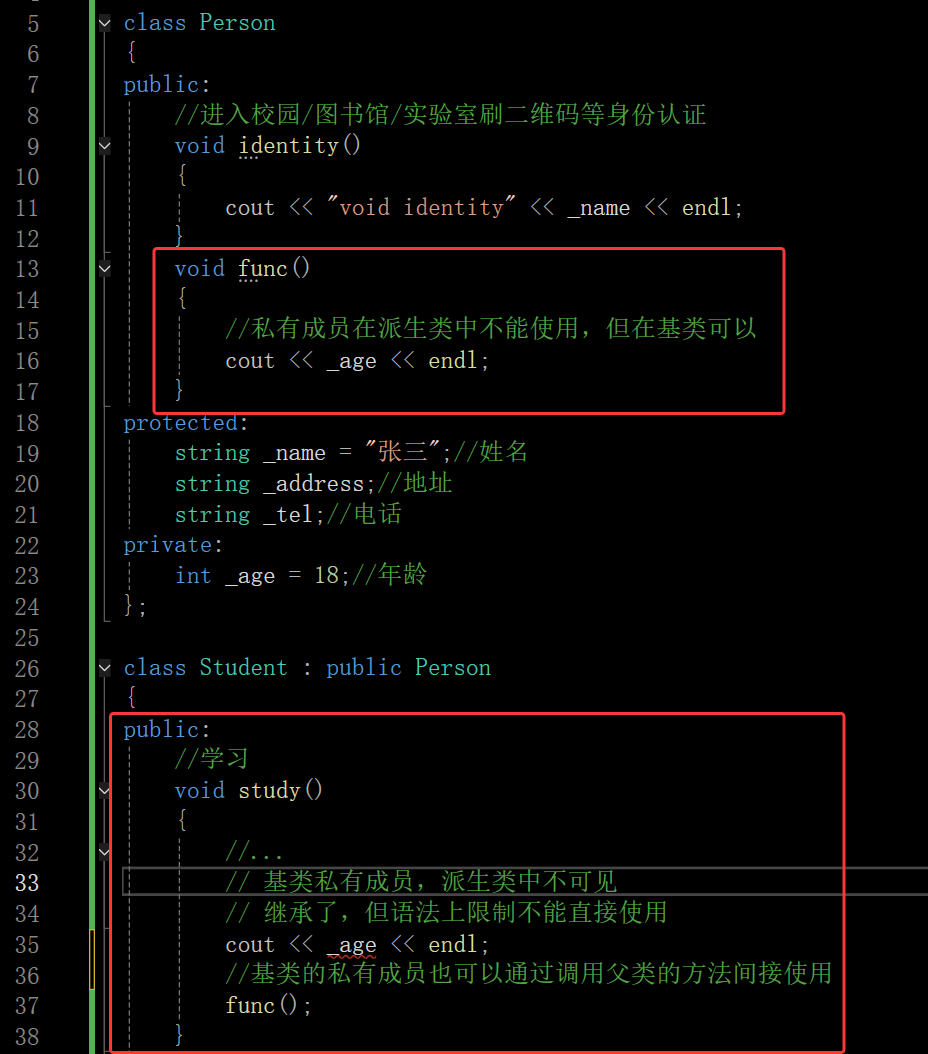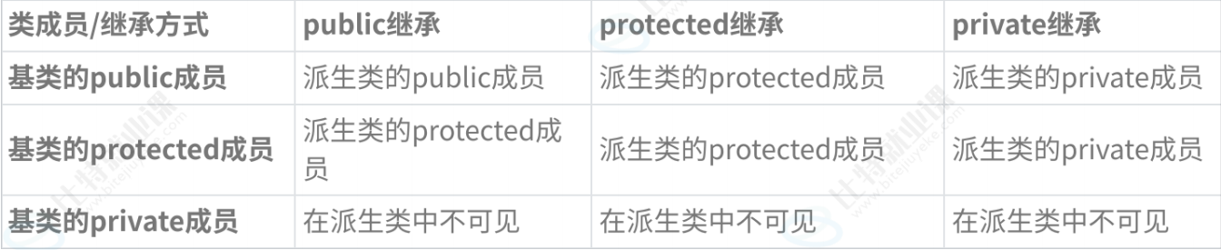 实际上面的表格我们进行一下总结就会发现,基类的私有成员在派生类都是不可见。基类的其他成员在派生类的访问方式==Min(成员在基类的访问限定符,继承方式),public > protected > private。