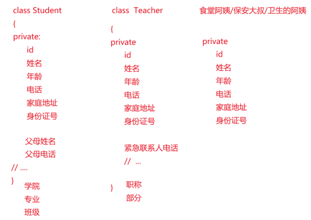 - 比如图片中的Student、Teacher、食堂阿姨等类,都包含姓名、年龄、电话、地址等重复的成员变量,以及identity()身份认证等重复的成员函数。