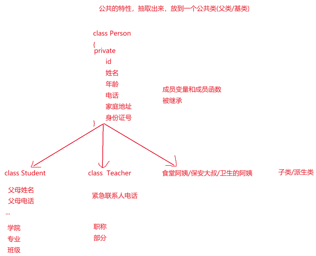 将多个相似类的公共成员(变量 + 函数)抽取到一个公共的父类(基类)中,比如图片中的Person类,包含id、姓名、年龄、电话、家庭地址等公共属性,以及identity()公共方法。 - 子类继承父类