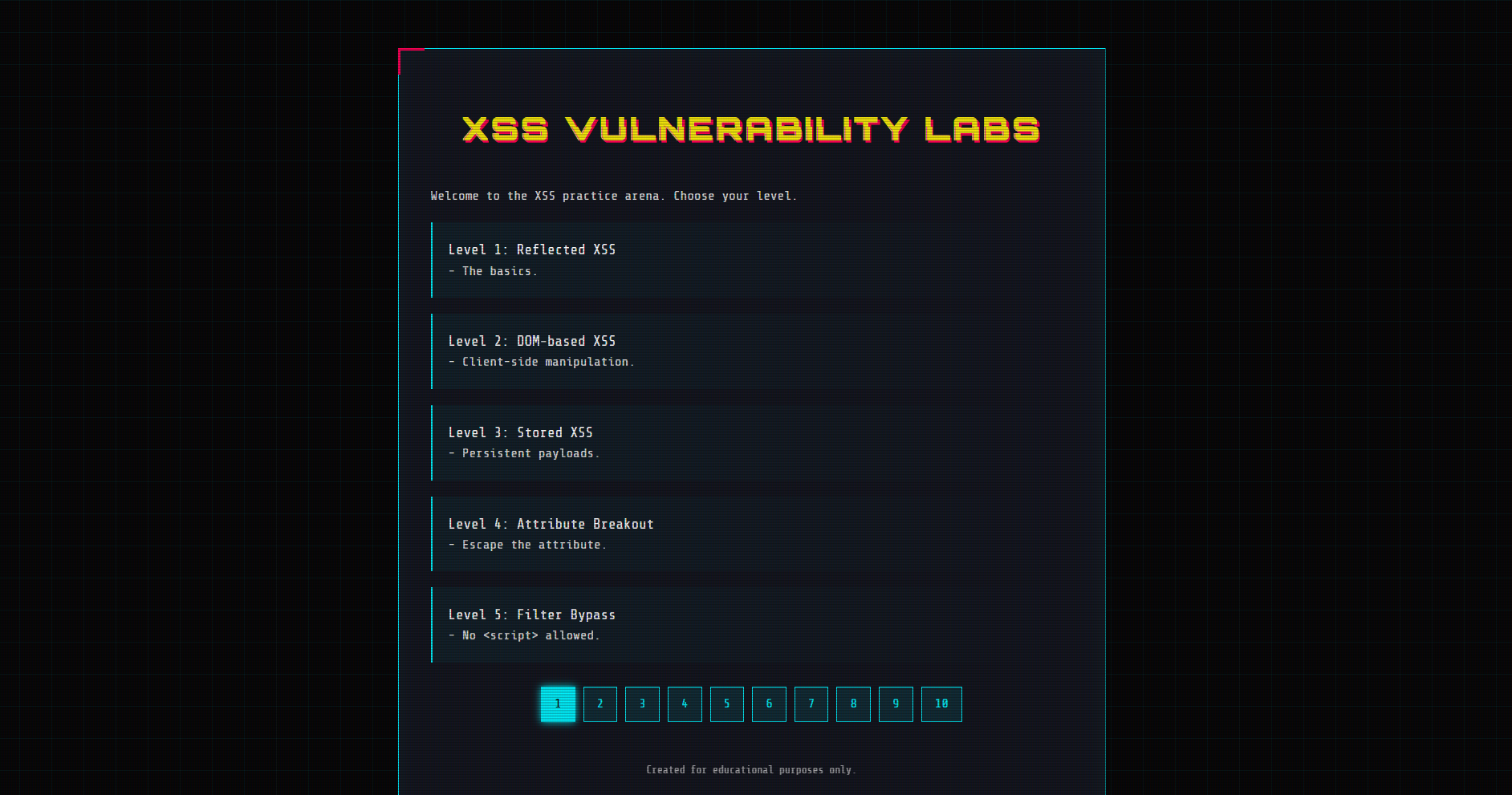 XSS-Sec 靶场项目是一个以"实战为导向"的 XSS 漏洞练习靶场,覆盖反射型、存储型、DOM 型、SVG、CSP、框架注入、协议绕过等多种场景。页面样式统一,逻辑清晰,适合系统化学习与教学演示。