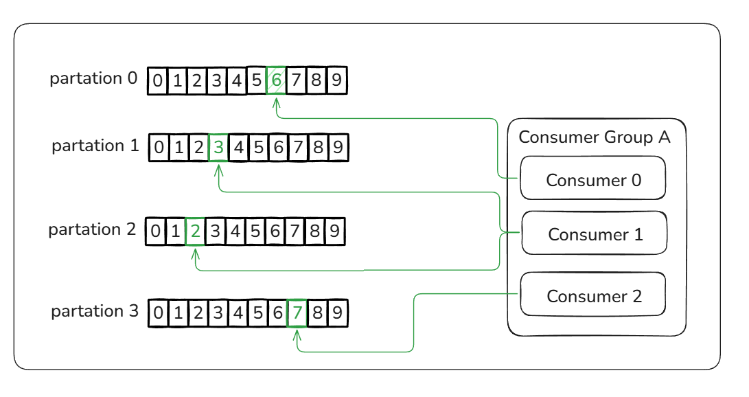 多个消费者可以组成一个消费者组(consumer group),每个消费者组都有一个组id!同一个消费组者的消费者可以消费同一topic下不同分区的数据,但是不会组内多个消费者消费同一分区的数据!!!如下图: