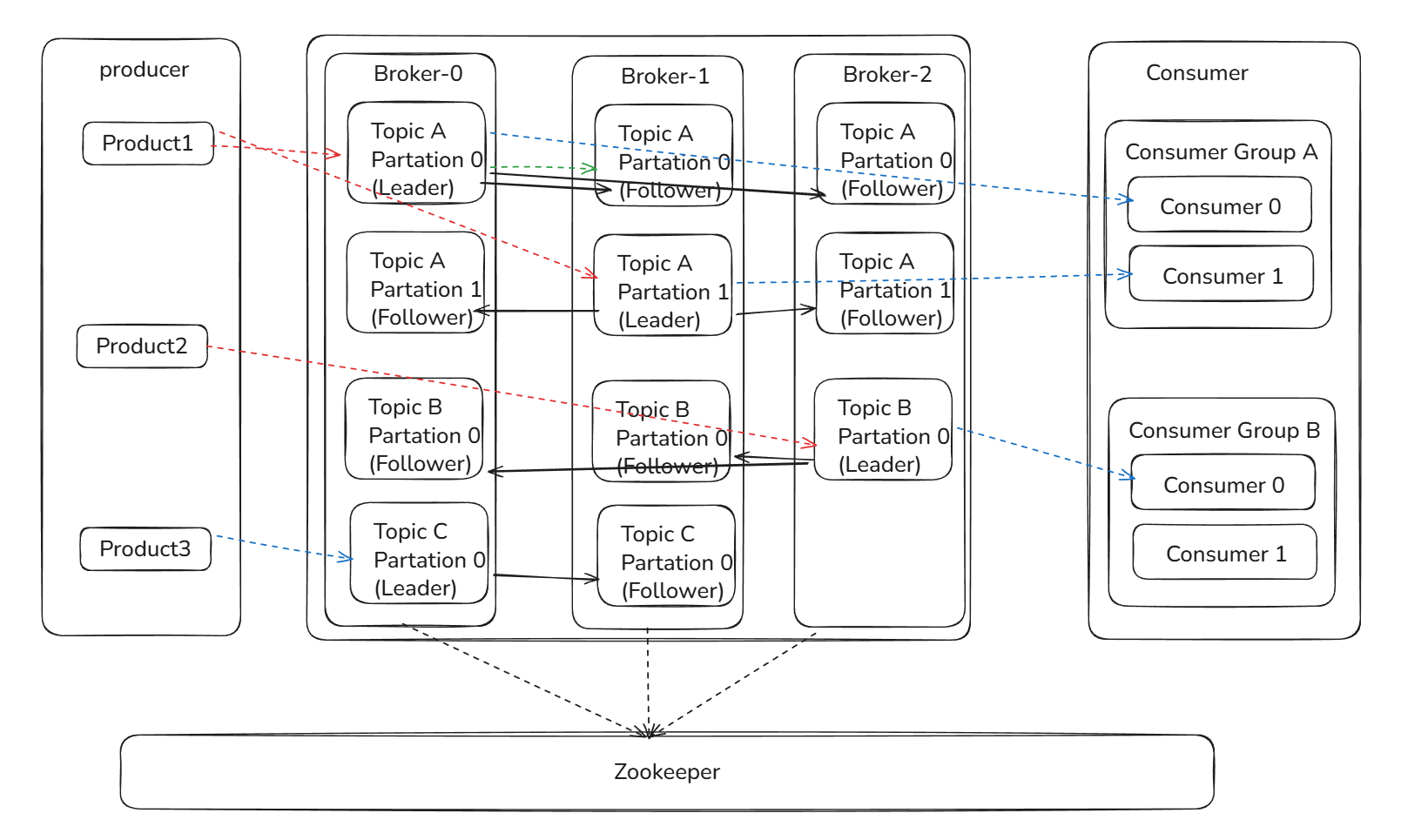 Zookeeper:kafka集群依赖zookeeper来保存集群的的元信息,来保证系统的可用性。 (新版本的移除掉了zookeeper,内部实现)
