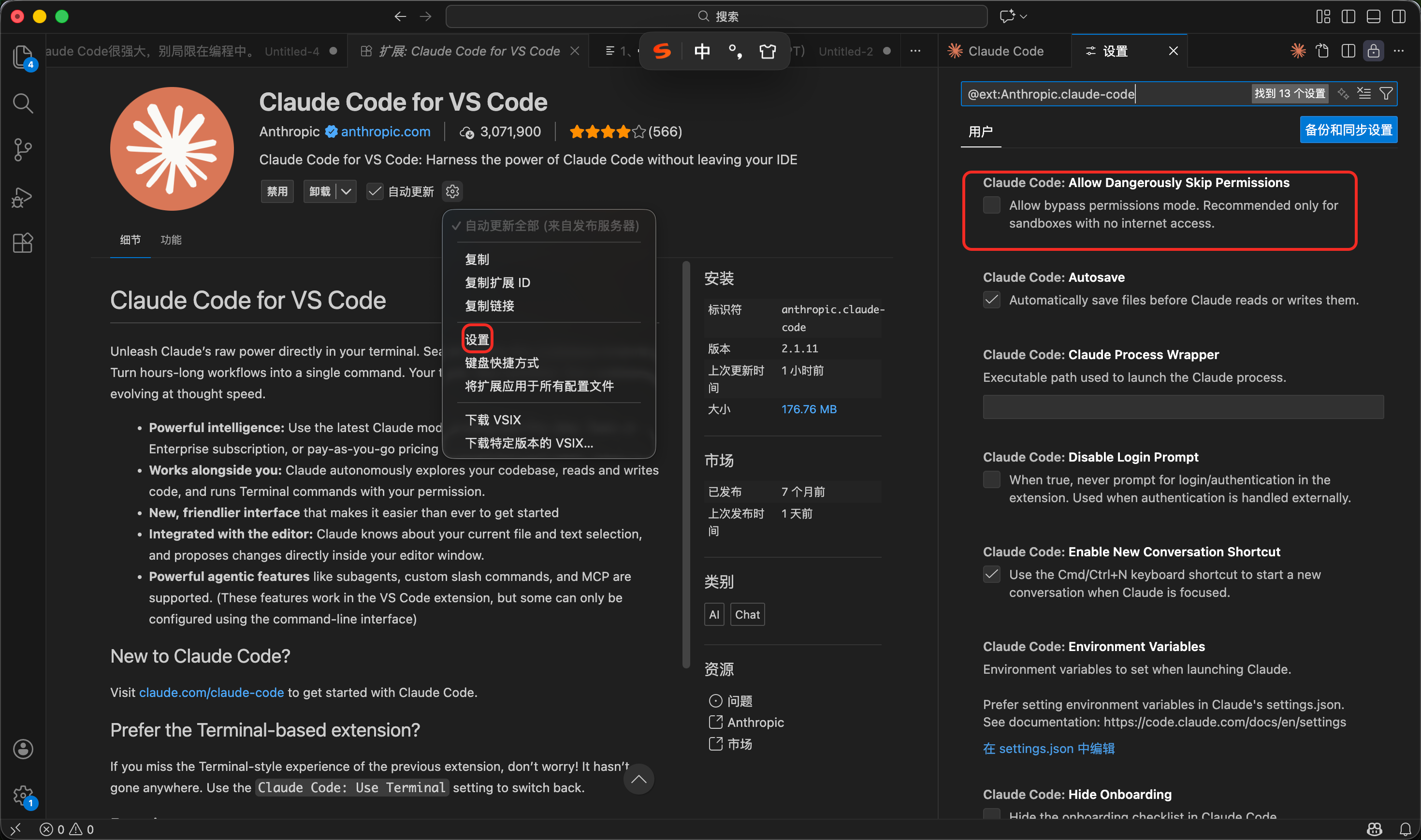 默认状态下,Claude code 只能在 plan、手动确认、自动编辑三种模式选择,可以在 cc 插件里开启「Allow Dangerously Skip Permissions」,这样能开启全自动模式,cc 能自动运行命令,无需二次确认。下面的选项里,也可以把全自动模式配置为默认模式。