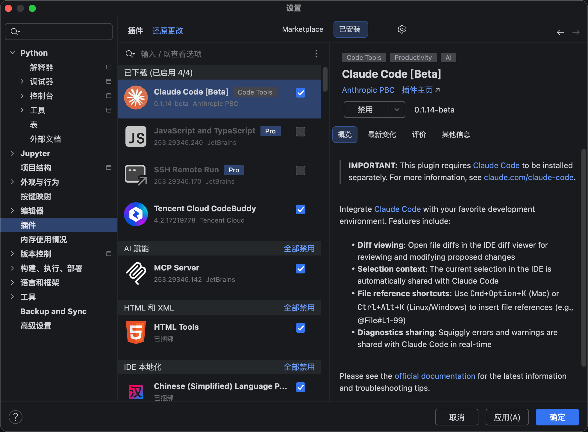 Claude Code 通过专用插件与 JetBrains IDEs 集成,提供交互式差异查看、选择上下文共享等功能。