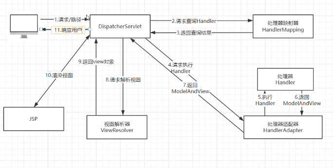Handler后,HandlerMapping会把Handler的信息(如 Controller 方法、拦截器等)返回给DispatcherServlet。