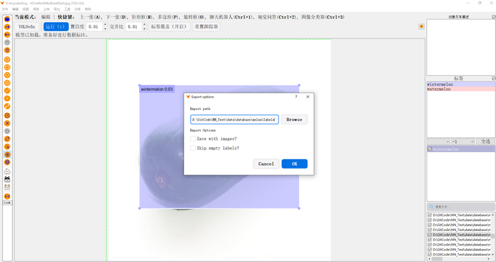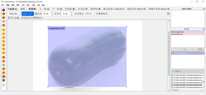自动标注 :首先添加图像文件,然后点击左侧的"自动标注"按钮,若未选中模型,点击"没有模型"按钮,选择对应的.yaml文件,文件内容如下:模型加载后,点击左侧的"一次运行所有图片"按钮进行自动标注,结果如下图所示: