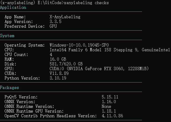 可通过执行命令"xanylabeling checks"进行验证,如下图所示: