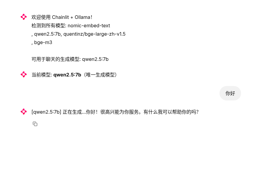 await cl.Message(content="提示:当前只有 embedding 模型,无法正常聊天。请运行 `ollama pull qwen2.5` 或其他生成模型后重启。").send()