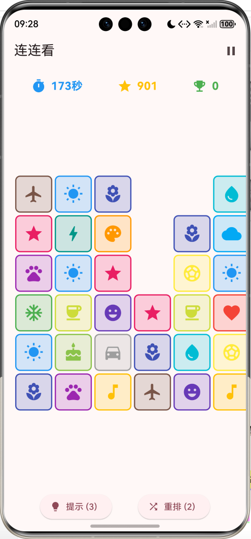 连连看是一款经典的益智消除游戏,考验玩家的观察力和反应速度。本文将带你从零开始,使用Flutter开发一个功能完整的连连看游戏,包含路径查找、计时挑战、提示和重排等功能。