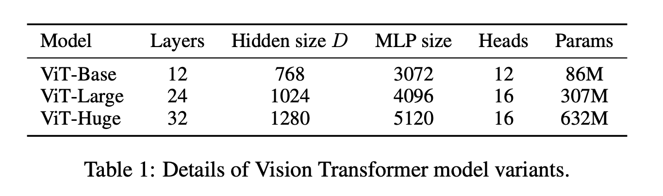 模型变体。我们基于BERT(Devlin et al., 2019)使用的配置制定ViT配置,如表1所示。"Base"和"Large"模型直接采用自BERT,我们添加了更大的"Huge"模型。在下文中,我们使用简写表示模型大小和输入块大小:例如,ViT-L/16表示具有16x16输入块大小的"Large"变体。请注意,Transformer的序列长度与块大小的平方成反比,因此具有较小块大小的模型在计算上更昂贵。