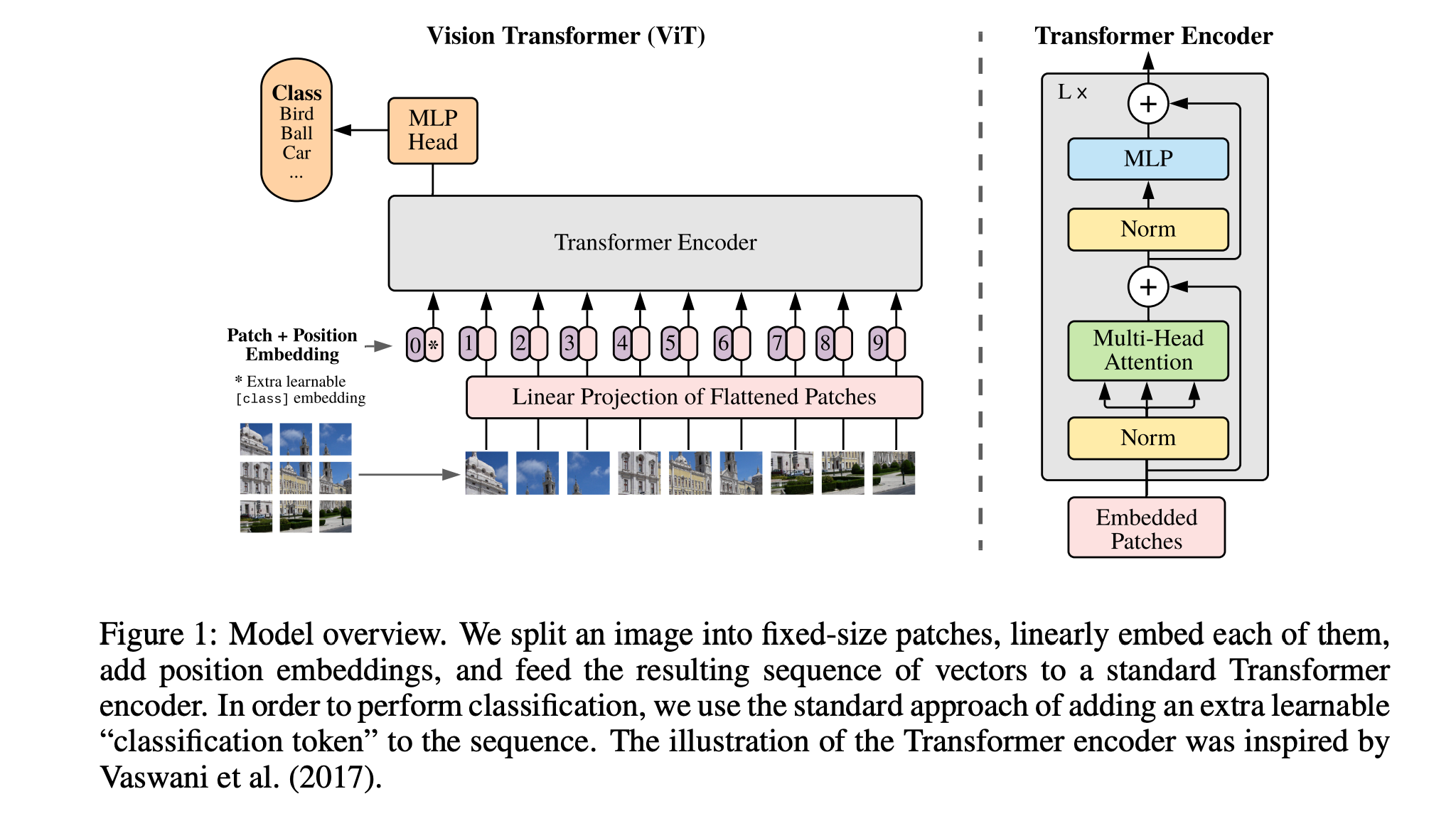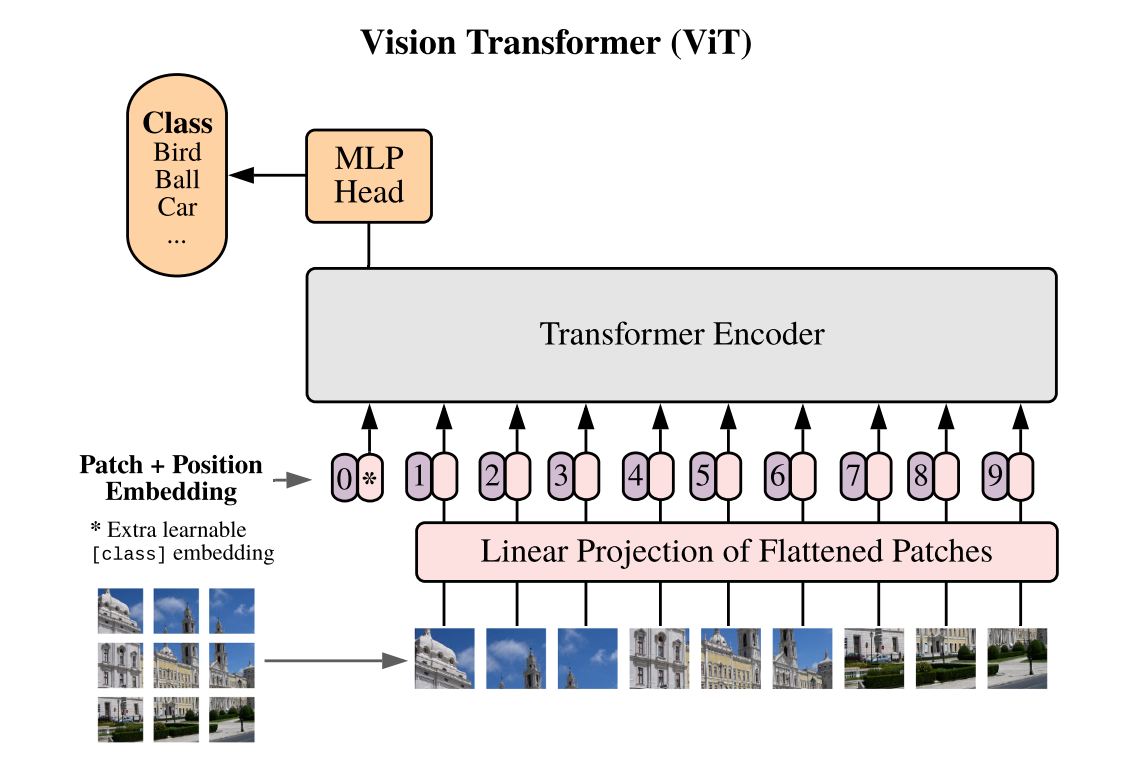 ViT的核心流程是将图像视为一系列图像块的序列,并通过标准Transformer编码器处理这些序列。