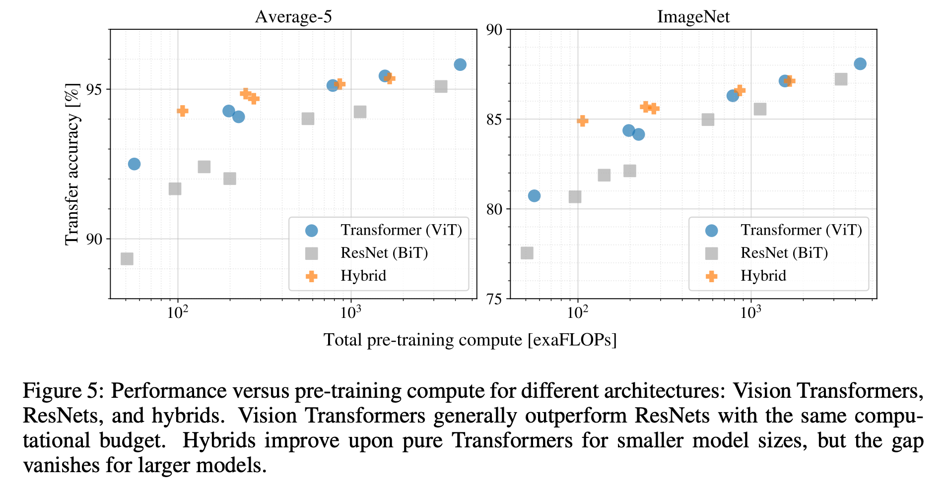我们通过评估从JFT-300M迁移的性能,对不同模型进行了受控的缩放研究。在这种设置下,数据大小不会限制模型的性能,我们评估每个模型的性能与预训练成本。模型集包括:7个ResNet,R50x1、R50x2、R101x1、R152x1、R152x2,预训练7个周期,加上R152x2和R200x3预训练14个周期;6个视觉Transformer,ViT-B/32、B/16、L/32、L/16,预训练7个周期,加上L/16和H/14预训练14个周期;以及5个混合模型,R50+ViT-B/32、B/16、L/32、L/16预训练7个周期,加上R50+ViT-L/16预训练14个周期(对于混合模型,模型名称末尾的数字不代表块大小,而是ResNet主干中的总下采样率)。