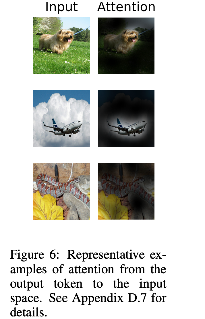 我们发现一些头部在最低层已经关注图像的大部分,表明整合全局信息的能力确实被模型使用。其他注意力头部在低层具有持续较小的注意力距离。这种高度局部化的注意力在应用ResNet before Transformer的混合模型中不太明显(图7,右),表明其可能服务于与CNN中早期卷积层类似的功能。此外,注意力距离随着网络深度增加。全局上,我们发现模型关注与分类语义相关的图像区域(图6)。