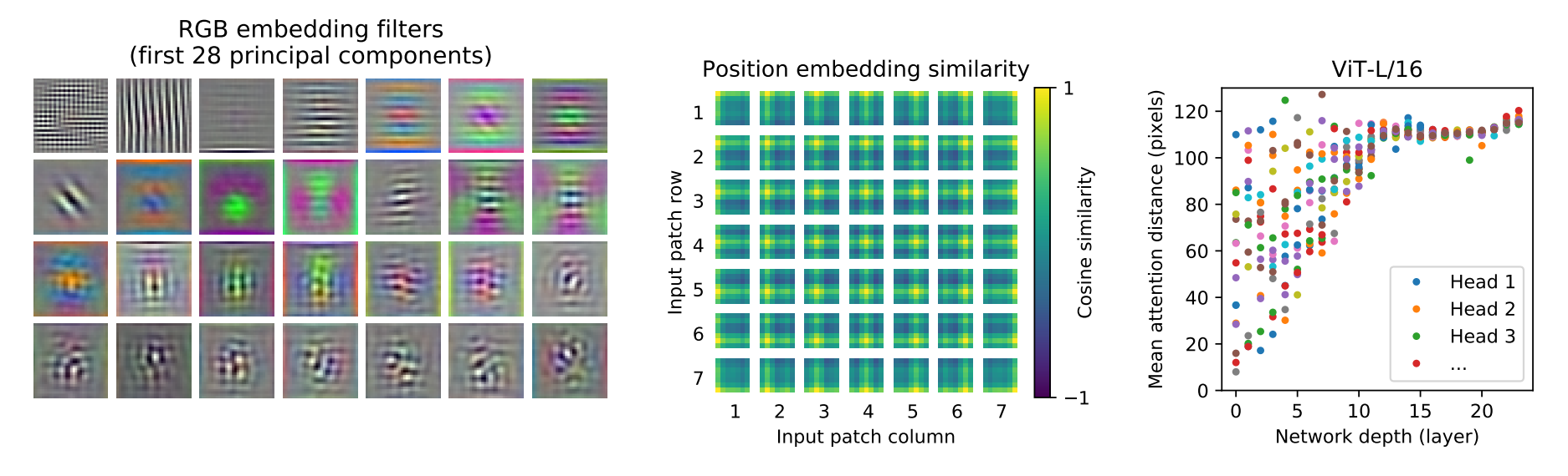 为了开始理解视觉Transformer如何处理图像数据,我们分析了其内部表示。视觉Transformer的第一层将展平的块线性投影到低维空间(公式1)。图7(左)显示了学习到的嵌入滤波器的顶部主成分。这些成分类似于每个块内精细结构的低维表示的合理基函数。