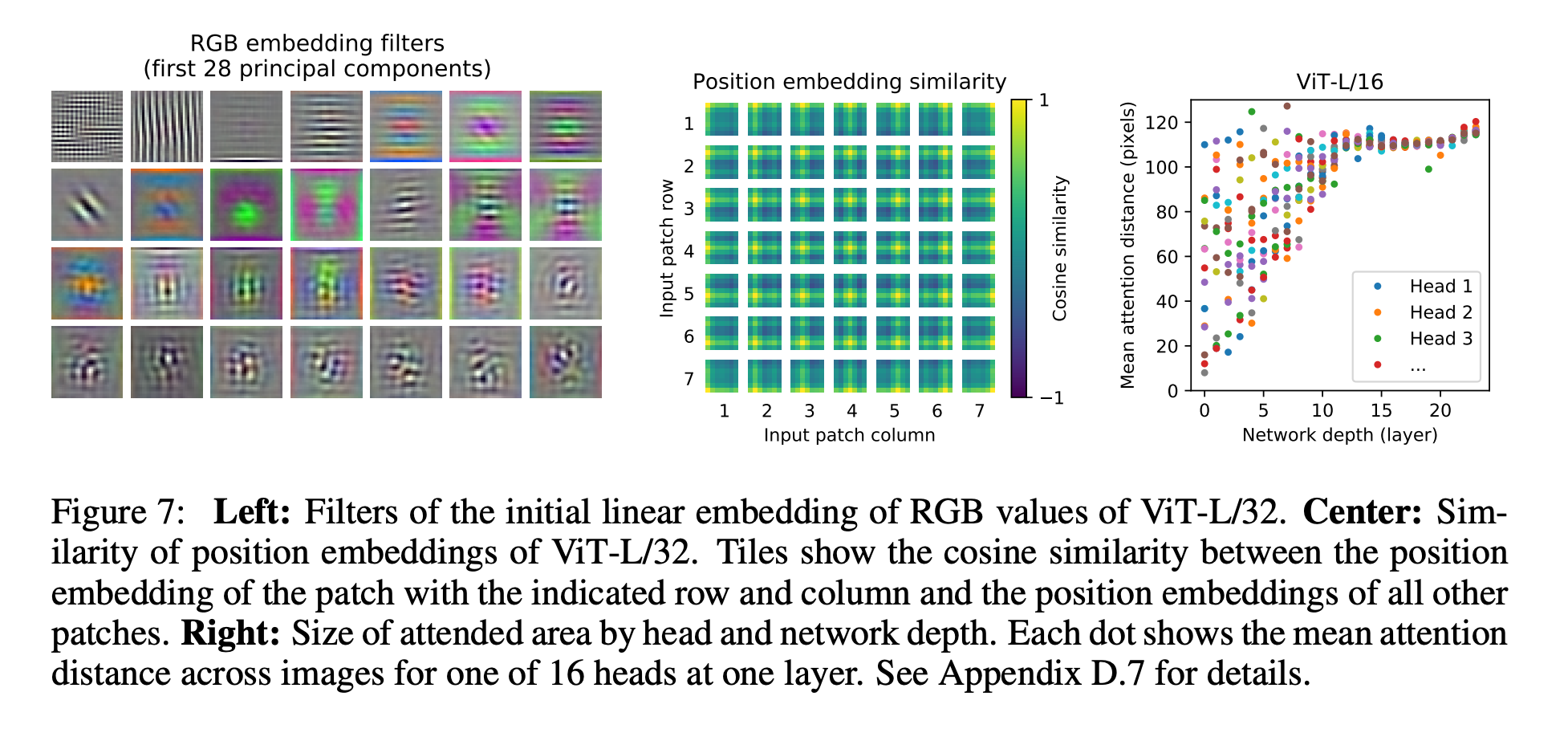 投影后,学习到的位置嵌入被添加到块表示中。图7(中)显示模型学习在位置嵌入的相似性中对图像中的距离进行编码,即较近的块往往具有更相似的位置嵌入。此外,出现了行列结构;同一行/列中的块具有相似的嵌入。最后,对于较大的网格,有时会出现正弦结构(附录D)。位置嵌入学习表示2D图像拓扑解释了为什么手工制作的2D感知嵌入变体没有产生改进(附录D.4)。