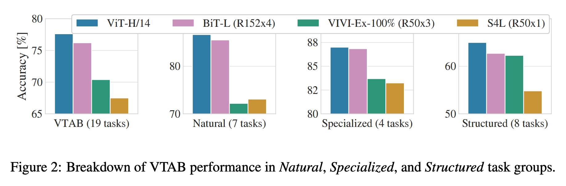 图2将VTAB任务分解为各自的组,并与该基准上的先前SOTA方法进行比较:BiT、VIVI------一个在ImageNet和YouTube上共同训练的ResNet(Tschannen et al., 2020),以及S4L------在ImageNet上的监督加半监督学习(Zhai et al., 2019a)。ViT-H/14在自然和结构化任务上优于BiT-R152x4和其他方法。在专业任务上,前两个模型的性能相似。