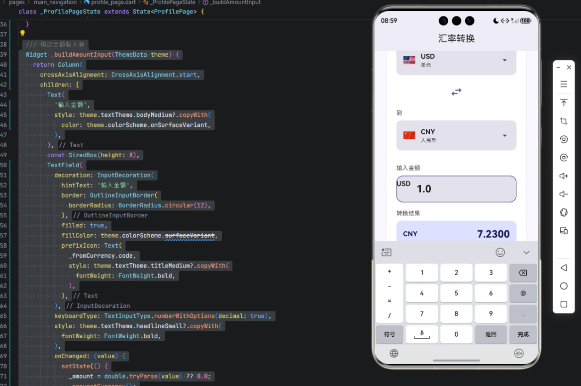 _convertCurrency()中,便于单元测试和复用。 - 使用 Flutter 的主题和颜色方案可以保证不同设备上的视觉一致性。