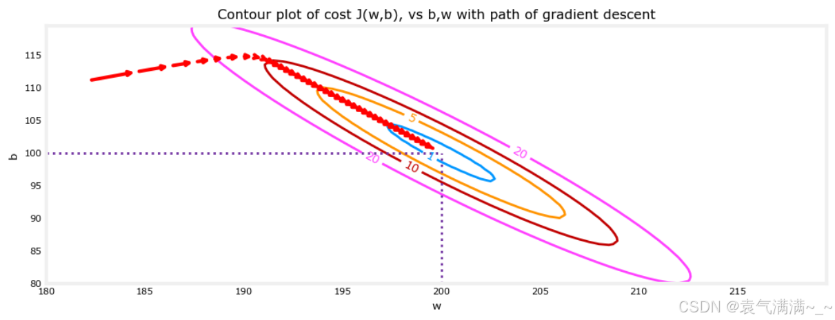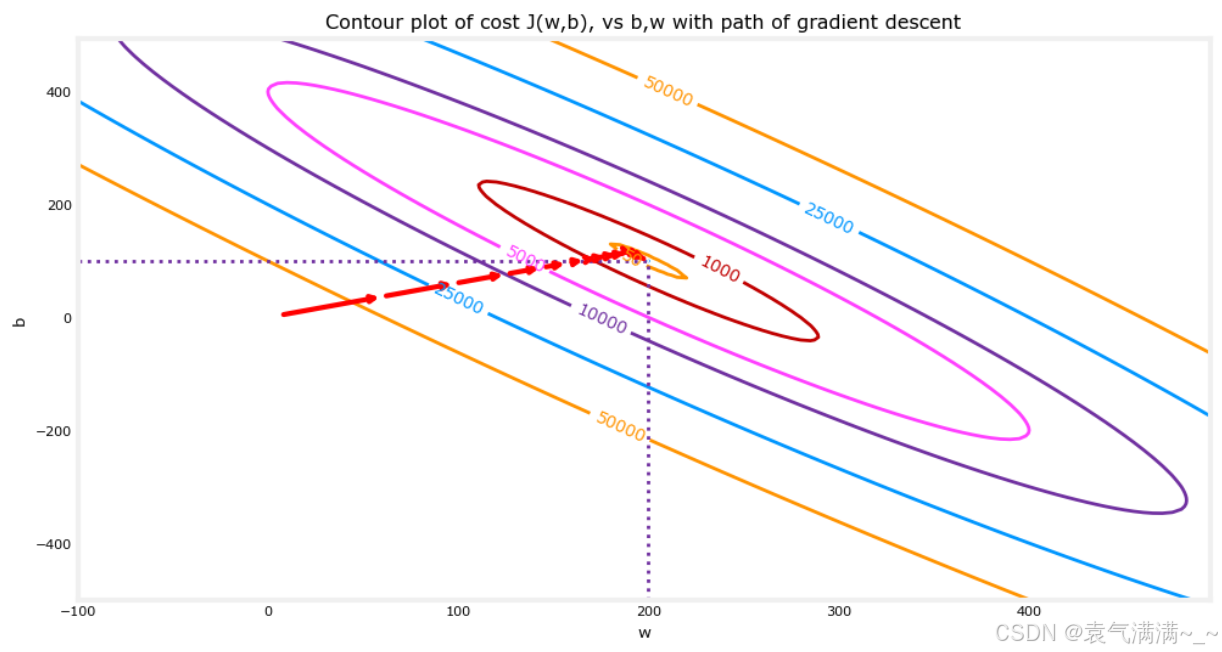 # 在成本(w,b)的等高线图上绘制迭代成本