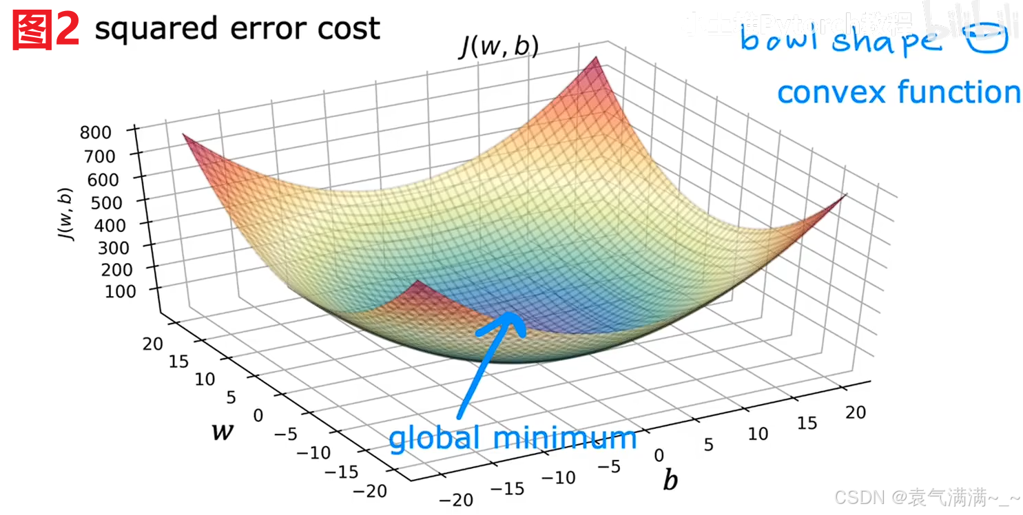 梯度下降可能会陷入局部最小值而不是全局最小值(图1),但使用线性回归的平方误差代价函数时,由于代价函数是一个凸函数,所以不会有多个局部最小值,只有一个最低点,既是全局最小值又是局部最小值(图2)。
