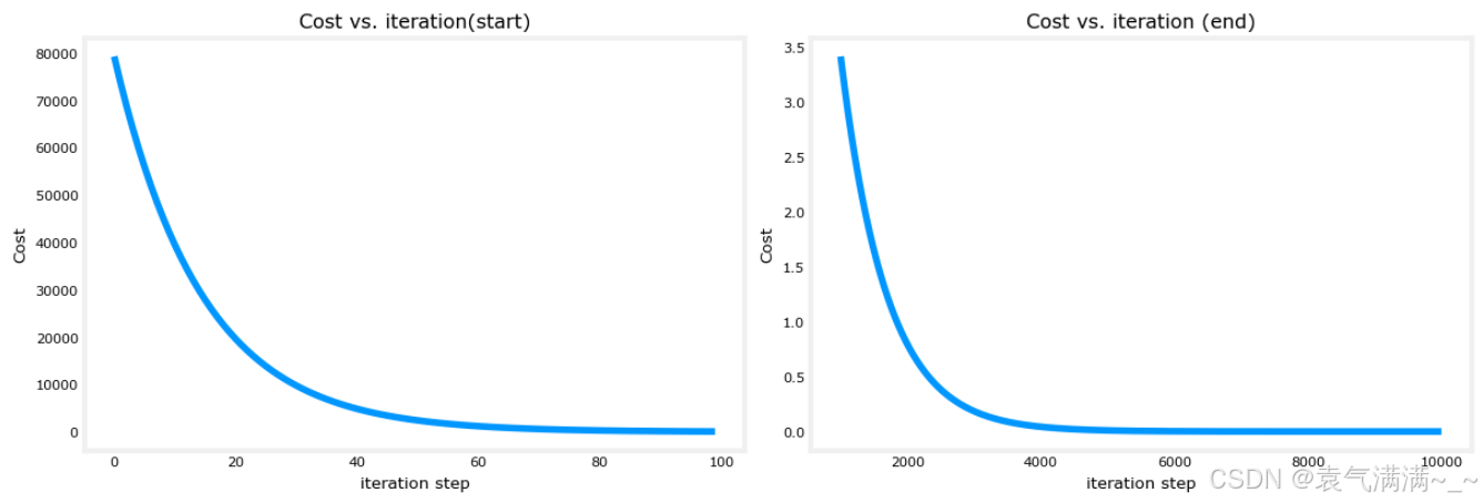 ax1.set_title("Cost vs. iteration(start)"); ax2.set_title("Cost vs. iteration (end)")