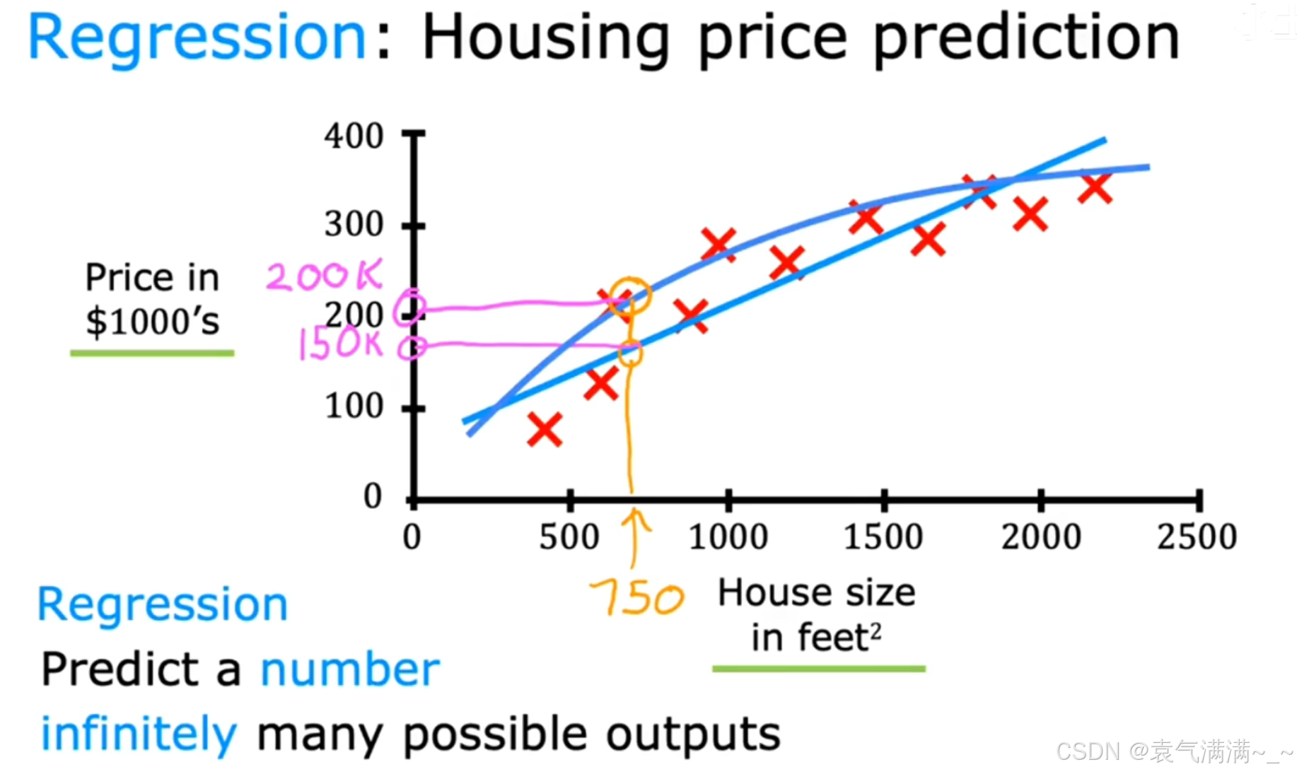 模型(图中的直线或曲线)会尝试去拟合这些数据点,当我们有一个新的输入(比如房屋面积为750平方英尺),模型给出一个预测的价格(比如150k美元)。这就是一个典型的回归问题,其目标是预测一个数字。
