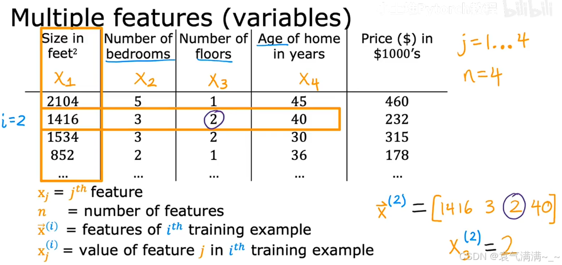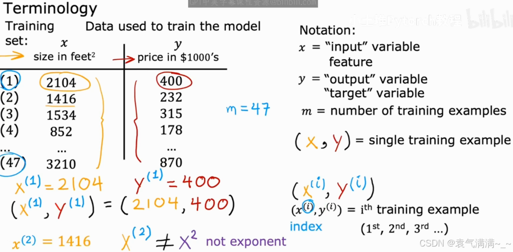 - (x⁽ⁱ⁾, y⁽ⁱ⁾): 表示第 i 个训练样本。这里的上标 (i) 只是一个索引 (index),代表第几行数据,它不是数学上的指数或次方。eg:(x⁽¹⁾, y⁽¹⁾) 就代表第一个训练样本,即 (2104, 400)。