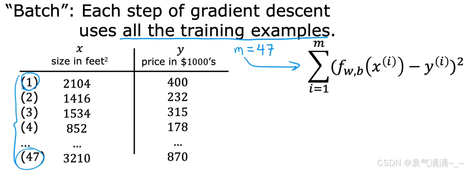 batch→在梯度下降的每一步,都使用了所有的训练样本 i∈[1,m] 。
