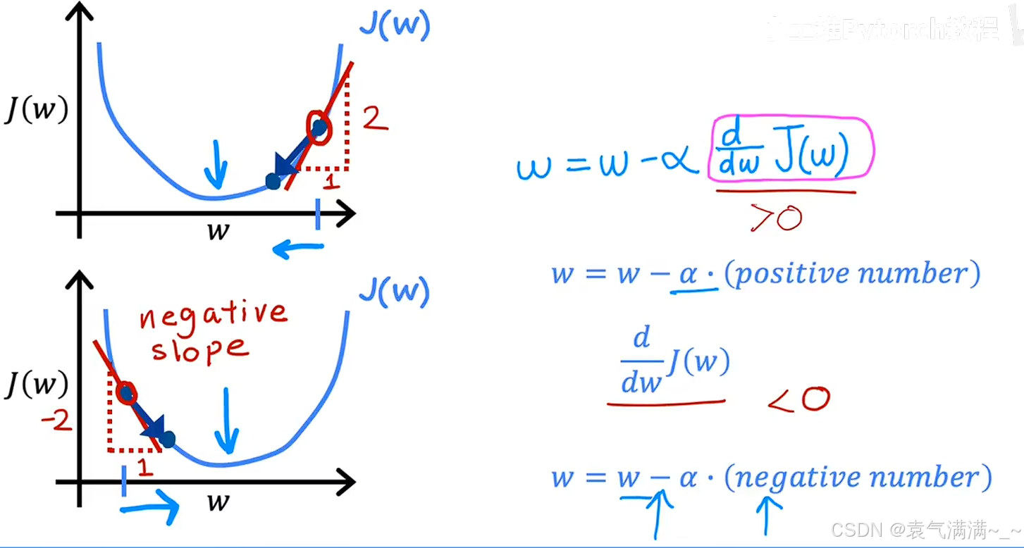 > 0,w减去正数得到一个比原来更小的值,此时w值向左移动,更靠近最低点