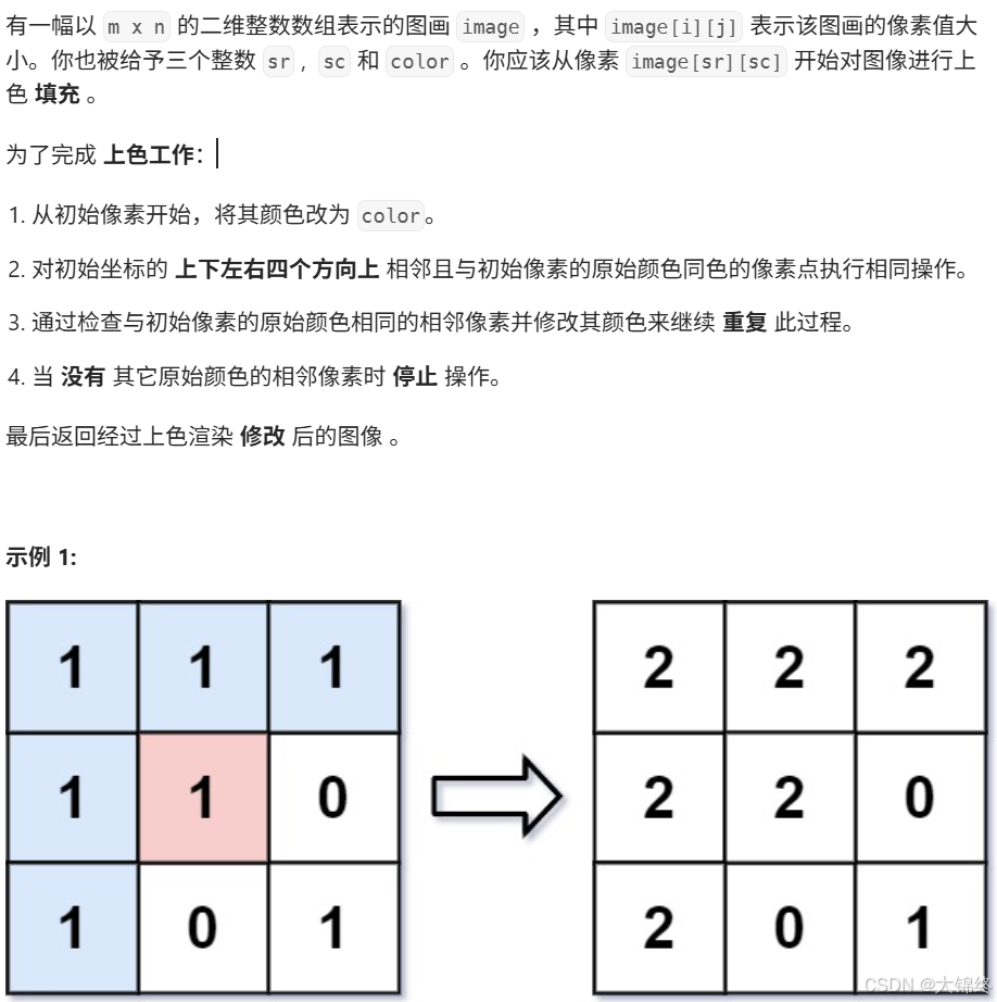 从起始位置,在二维矩阵中进行深搜,利用向量数组表示该位置四周方向,用prev变量提前记录原位置颜色,边界条件判断若初始位置颜色等于color证明不用dfs直接返回即可,否则以此位置只要满足原始颜色等于prev就进行深搜。