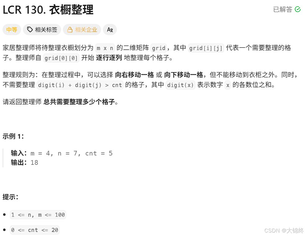 二维矩阵dfs,需要vis数组标记是否使用过,计算每个数的数位之和,当符合条件返回值++并进行dfs