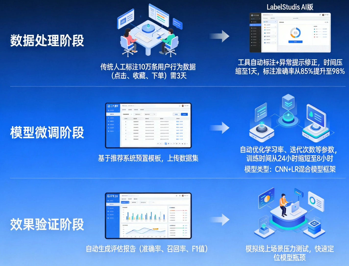 效果验证阶段 :AI工具自动生成模型评估报告(准确率、召回率、F1值),同时模拟线上场景进行压力测试,快速定位模型瓶颈。