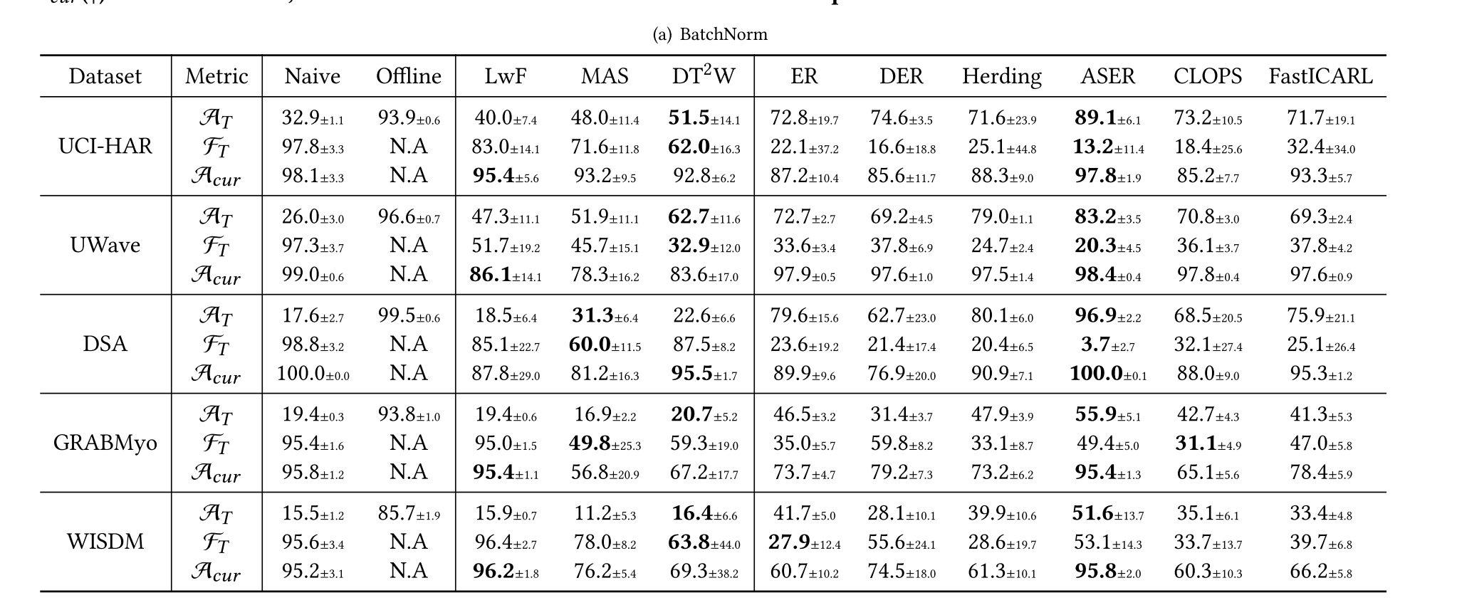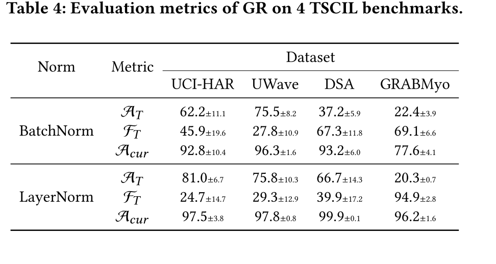 表 3:使用 (a) BatchNorm 或 (b) LayerNorm 进行归一化时,基于正则化和基于 ER 的方法在我们的 5 个 TSCIL 基准上的评估指标。 报告第 4.4 节中引入的度量标准,即 A𝑇(↑)、F𝑇(↓) 和 A𝑐𝑢𝑟 (↑)。 对于每个指标,都会报告 5 次运行的平均值和置信区间。