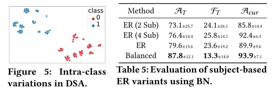 问题 6:类内差异如何影响 TSCIL? 时间序列数据通常从不同的主题或来源收集,每个主题或来源可能表现出不同的输入域。 例如,图 5 描述了在 DSA 的两个类上训练的 VAE 内的特征分布。 值得注意的是,每个类别在特征空间内形成八个簇,每个簇对应一个不同的主题。 尽管这种现象在 TSCIL 中经常被忽视,但我们发现不同科目之间的分布变化可能会在很大程度上影响学习成绩。 我们在附录 B.2 中进一步分析了这种受试者分布如何影响基于 ER 的方法。 为了进一步研究这一点,我们使用 DSA 数据集将原始 ER 基线与其两个变体进行比较。 原始的 ER 采用了 MemoryUpdate 的水库采样,理论上确保缓冲区中的内存样本与原始分布独立同分布。 然而,其基于随机选择的MemoryRetrieval策略可能无法确保每批重放样本都遵循主题分布。 我们的第一个变体修改了MemoryUpdate策略,只从部分受试者中选择样本,故意导致内存样本的受试者分布与实际分布存在偏差。 第二种变体保留了原始的 MemoryUpdate 策略,但改进了 MemoryRetrieval 策略,以确保内存样本在每个检索批次中都是主题平衡的。 评估指标如表 5 所示,其中前两种方法分别对应于来自两个和四个受试者的第一个变量采样。 "平衡"代表第二个平衡检索变体。