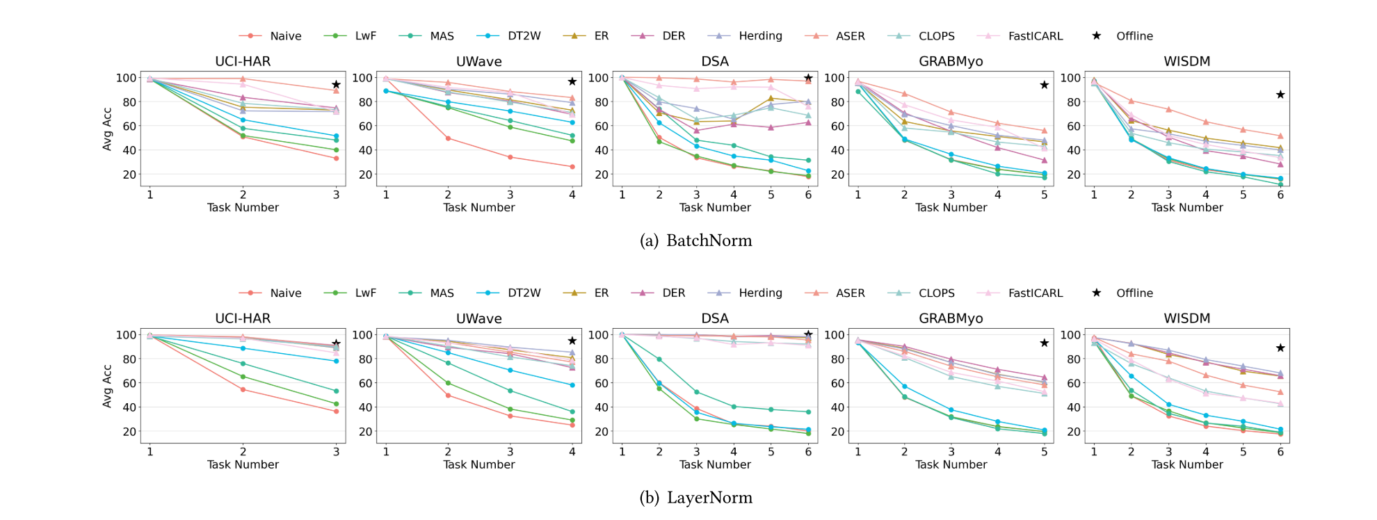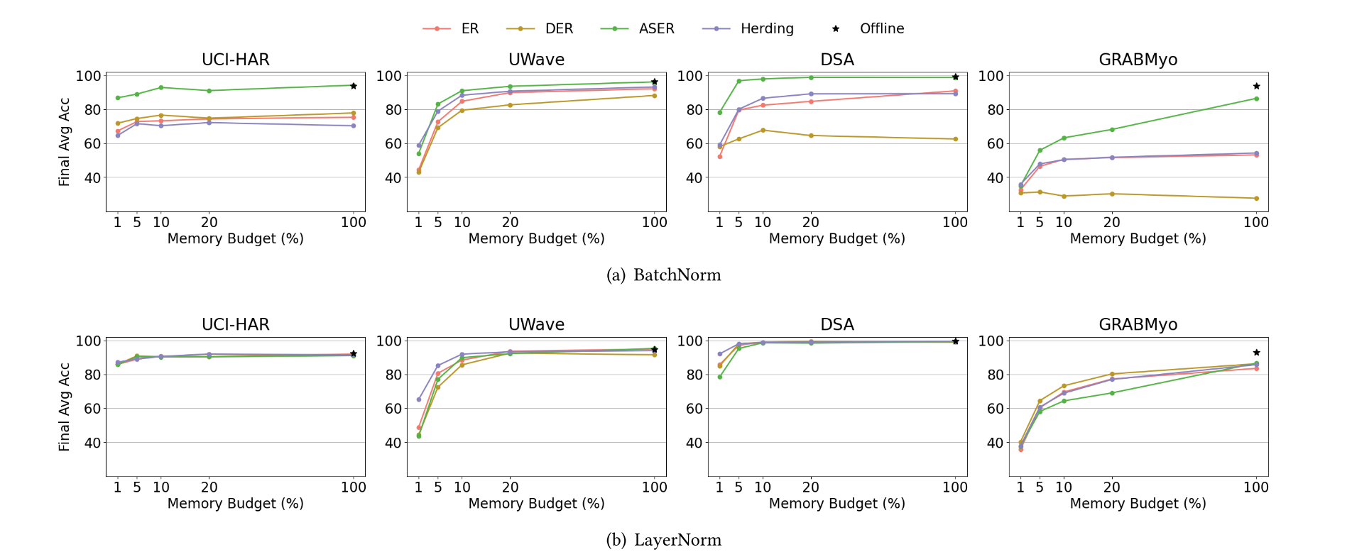 问题1:正则化vsER在TSCIL中如何表现? 与图像领域的研究结果类似 [39, 48],基于 ER 的方法稳定优于基于正则化的方法,而无需在 TSIL 中保存样本。 正如预期的那样,在不使用任何 CIL 技术的情况下,Naive 不可避免地会导致灾难性的遗忘。 通过保存内存样本,所有基于 ER 的方法都有效地减少了跨数据集的遗忘。 令人惊讶的是,当使用 LN 进行归一化时,即使是具有 5% 内存预算的基本 ER 方法有时也能获得接近离线训练上限的结果。 相比之下,基于正则化的方法仅在任务较少的简单基准测试中显示出明显的优势,例如 UCI-HAR 和 UWave。 在这些数据集中,DT2W 始终优于 MAS,而 MAS 又提供了比 LwF 更好的结果。 然而,在更具挑战性的基准中,相同的正则化方法会几乎完全是失败的。具体地说,他们努力平衡稳定性和可塑性,导致显著的遗忘(LWF)或降低学习精度(MAS和DT2W)。