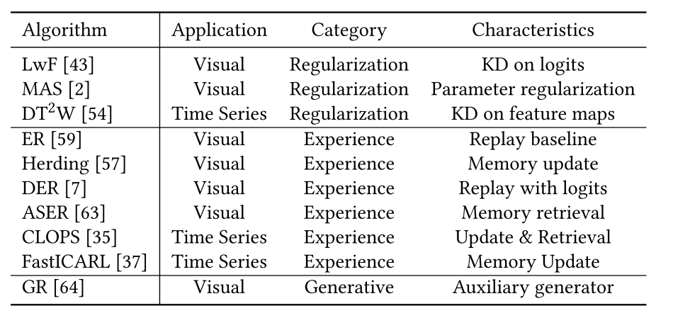 在现有的 TSCIL 文献中,一个普遍的主题是已建立的通用 CIL 方法在时间序列场景中的应用。 文献[11]提出了一种基于EWC[34]和iCaRL[57]的在线用户授权框架,根据生物医学TS信号不断识别新用户。 [36]将经典的基于正则化和基于重放的方法应用于来自移动和嵌入式传感应用的时间序列。 [21]使用循环神经网络(RNN)在简单的 TS 数据集上评估各种通用的 CIL 方法,例如 Stroke-MNIST [24] 和 AudioSet [22]。 这些工作的结果展示了使用通用 CIL 方法来减轻 TS 数据灾难性遗忘的有效性。 除了适应图像领域的现有方法之外,还提出了针对时态数据的创新 CIL 算法。 [19]和[82]专注于RNN架构并提出了特定的基于正则化的CIL算法。 DT2W [54]提出了一种基于soft-DTW [15]的新型知识蒸馏(KD)[27]策略,以缓解稳定性-可塑性困境。 许多方法都是围绕经验重放 (ER) 构建的 [10, 59]。 CLOPS[35]是一种基于ER的心律失常诊断方法,包括基于重要性的存储策略和基于不确定性的内存缓冲区管理检索策略。 为了实现高效的音频分类,[37] 引入了 iCaRL 的快速变体,用 KNN 代替群体选择,并利用量化来压缩内存样本。 MAPIC [67] 使用冻结特征提取器,将原型增强模块与基于距离的分类器结合起来,用于医疗数据上的小样本 CIL。 在生成重放领域,[75]使用高斯混合模型(GMM)不断训练自动编码器,以生成用于增量声音分类的伪音频频谱图数据。 [25]为每个任务采用单独的独立生成器,以适应不同任务中的可变输入维度。 [62] 针对不同呼吸音类别训练单独的 WaveGAN [18] 模型,并对合成样本进行隐私评估。 还探索了利用特征重放或原型的方法。 使用固定特征提取器,[41]和[42]用原型更新分类器,以实现少镜头类增量音频分类。 最后,还研究了基于架构的技术。 受 ExpertGate [3] 的启发,GIM [14] 采用级联模型结构,为每个新任务训练特定于任务的 RNN 模块。 与 RNN 一起,针对每个任务训练门控自动编码器,以在预测期间选择相应的模块。 此外,[66]提出了一个针对 RNN 的统一 GEM [46] 和 Net2Net [12] 的可扩展框架。 尽管该领域做出了努力,但仍缺乏对各种时间序列数据集的全面评估和比较。 此外,TSCIL 在许多关键方面都存在不一致的问题,包括数据集、学习协议、评估方案和主干网等。与数据标准化和超参数调整相关的一些有问题的做法甚至违反了 CIL 的基本原则。 为了解决这些问题,我们开发了一个标准的 TSIL 框架,以系统地、公平地评估 TS 数据上的不同 CIL 方法。