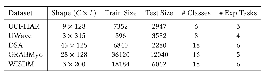 4.1 基准数据集 我们的 TSCIL 基准是利用开源的真实时间序列数据集建立的。 基于这些,我们的工具包提供了一种清晰的方式来自定义 CIL 设置,包括每个任务的类数,或每个类的训练样本量。 尽管如此,我们还是遵循 CIL 研究中的常见设置来报告本文中平衡训练设置的结果,其中每个类别的训练样本量大致相等。 我们强调这一假设的重要性有两个原因。 首先,它与视觉领域传统 CIL 研究中的大多数标准基准保持一致 [70],并促进使用标准评估指标,如果类别不平衡,这些指标可能会产生偏差。 其次,训练样本的多少直接影响每个分类的学习难度。 这种影响会影响 CIL 算法本身之外的性能,因此超出了本文的范围。 基于这样的考虑,数据集选自两个与 TS 相关的应用:人类活动识别(HAR)和手势识别。 一般来说,一组受试者/志愿者被要求在固定的时间内执行各种活动或手势。 这样的数据集适合 CIL,因为有足够的平衡类用于任务分割。 一些工作利用 HAR 数据集进行 CIL [31,32,61],但它们采用预处理向量作为输入样本。 相反,我们直接使用原始时间序列作为输入,专门关注 TS 模态。 在我们的配置中,每个数据集的 TS 样本表现出一致的形状,即序列长度和变量数量保持相同。 表 1 显示了所使用的数据集的概述。