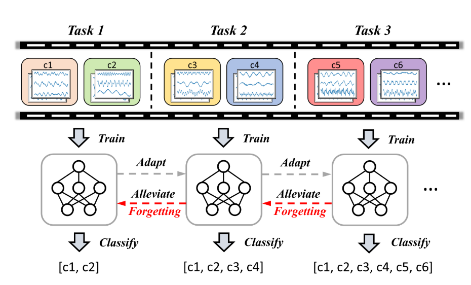 图1:动态任务序列上的时间序列分类-增量学习(TSCIL)过程示意图。