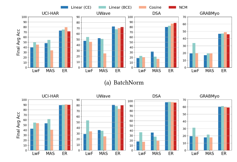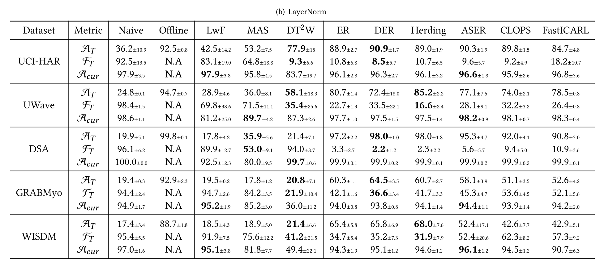 输入数据的标准化对于模型的训练至关重要。 许多 TSCIL 研究在任务分割之前应用 Z 分数归一化,并使用在整个数据集上计算的统计数据进行归一化 [11,36,82]。 这种做法违反了 CL 的基本原则,因为在训练之前无法访问完整的数据集。 为了解决这个问题,我们通过在模型第一层之前插入输入标准化层来应用实例标准化。 它可以是 LayerNorm (LN) [6] 或 InstanceNorm (IN) [68],而不包含可学习的仿射变换或偏差。 这可确保输入在特定维度上标准化为均值 0 和标准差 1。 输入归一化层的选择可以根据验证任务的性能来决定。 除了没有应用归一化的 WISDM 之外,我们对 UWave 应用 IN,而对其余数据集采用 LN。