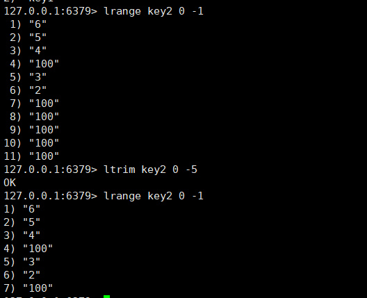 ltrim:用于删除,把指定范围内的元素保留,把其他的元素全部删除,此区间是一个闭区间。