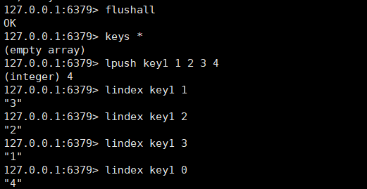 lpush :用于在列表中插入元素,一次可以只插入一个元素,也可以插入多个元素,这个插入是依次头插,比如说我们新创建了一个list,往里面插入1234四个数字,那么4是在头部。