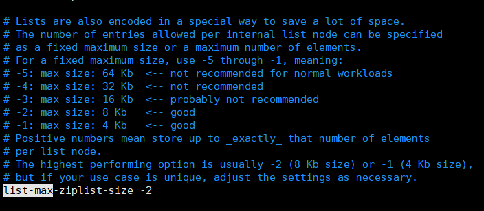 所以redis现在的配置项就改为list-max-ziplist-size了,如果没有修改过原先配置的话,就可以使用cd /etc/redis下的配置目录,查看这个配置项,这个配置项表示一个压缩列表的大小大于nkb的时候,就要分出另外一个节点进行保存。