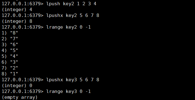 lpushx :当key存在的时候,将一个或者多个元素头插到list中,如果不存在直接返回,返回值是插入后的list长度。