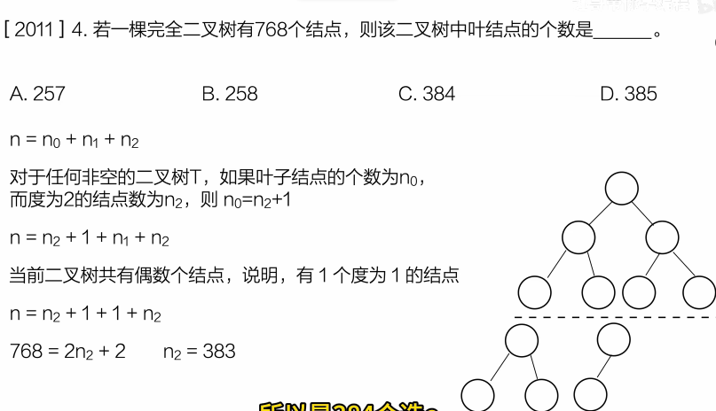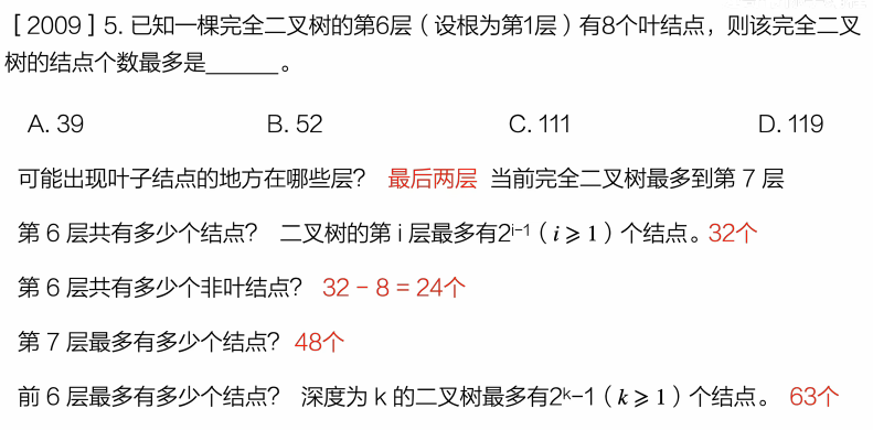 - 每个"不是叶子"的结点,都必须有2个孩子(因为完全二叉树中,内部结点一定有两个孩子),所以第7层能长出:24×2=48个结点