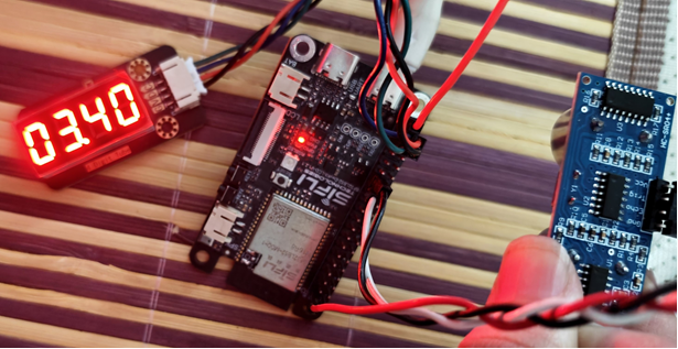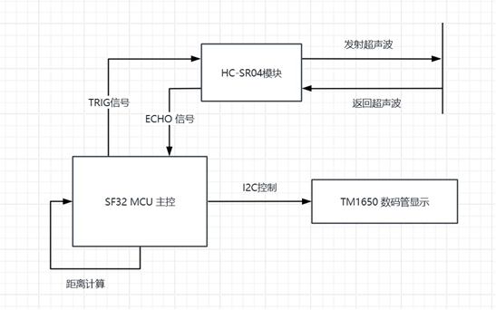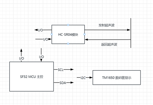 使用思澈科技SF32LB52-Devkit-LCD开发板,驱动TM1650 I2C接口控制的数码管,和HC-SR04超声波模块完成。其中SF32LB52-Devkit-LCD开发板 作为主控MCU控制HC-SR04超声波模块发射超声波,并读取Echo引脚记录超声波从发射到接收的时间间隔,根据公司 Distance = 343m/s * time / 2 得到距离值,然后通过MCU I2C外设将数据发送到TM1650 四位共阴极数码管中进行显示。最终完成超声波测距装置的实现。
