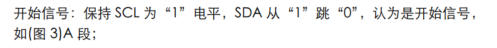 ,SCL:SET_SCL(1);拉高,在SCL为高电平期间,拉低SDA:SET_SDA(0);认为是开始信号。