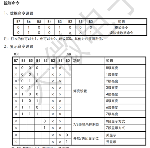 根据数据手册可知,写入地址0x48为控制命令设置,写入0x48指令后紧跟的数据为控制亮度段数,开关控制数据。