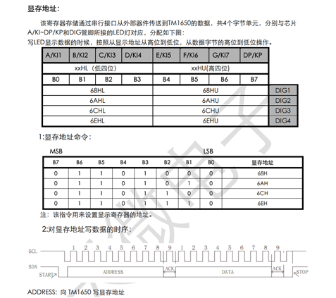 根据数据手册,写入地址0x68为显示数据存储地址,对应第一个数码管显示,0x6A对应第二个数码管的显存地址,输入地址数据后紧接一个8位数据,即可点亮对应数码管显示。